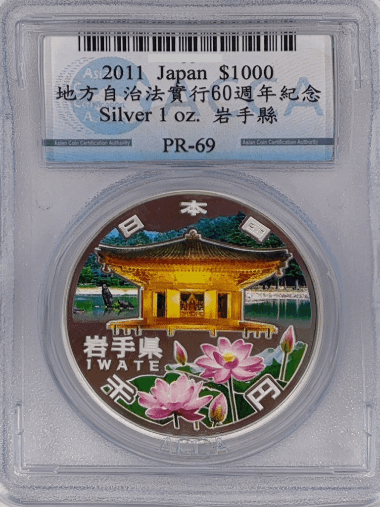 地方自治法施行60周年記念1000円銀貨・岩手県(平成23年銘)-ACCA鑑定コインを買取させて頂きました!!